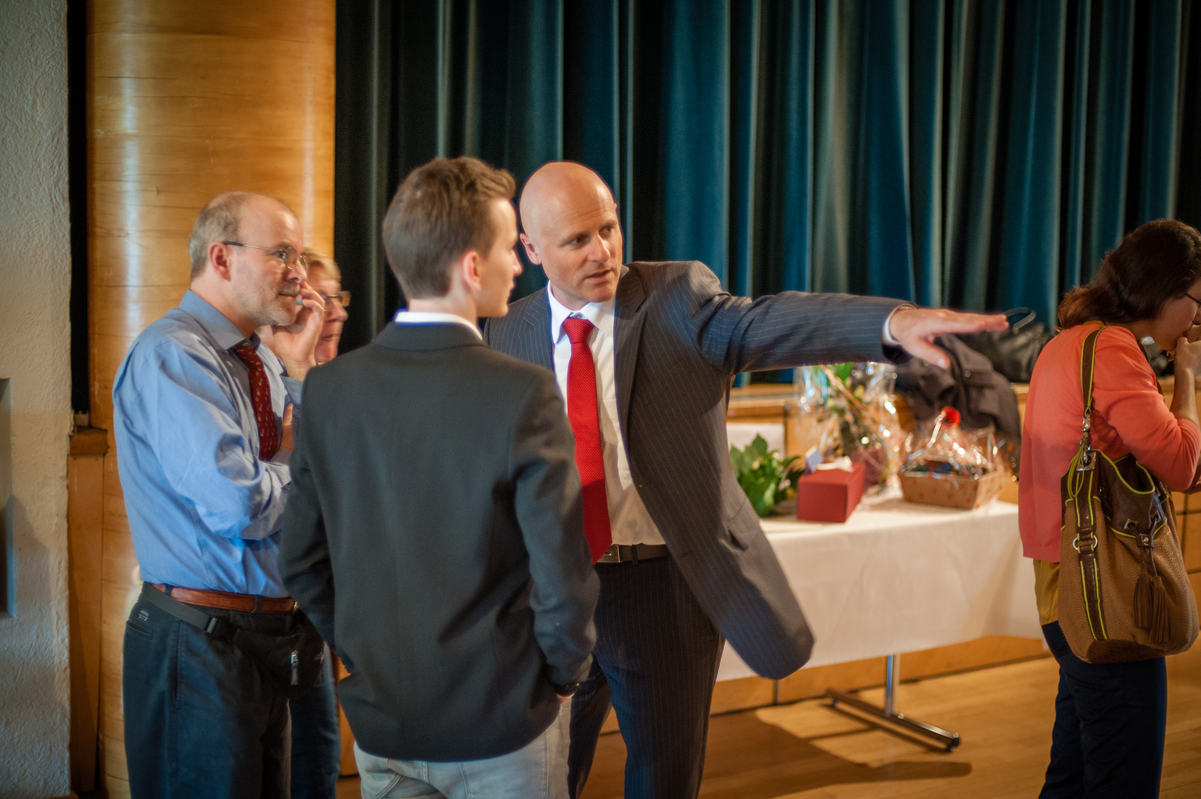 Erich (Freund von Lothar und ehemaliger Bürokollege) im Gespräch mit Fabio (Neffe von Lothar), Renato (Papa von Fabio) und Therese (Arbeitskollegin von Lothar). Rechts wurde Claudia (auch eine Arbeitskollegin von Lothar) beim Abbeissen erwischt. Es handelt sich vermutlich um eins der begehrten Lachs Brötchen.