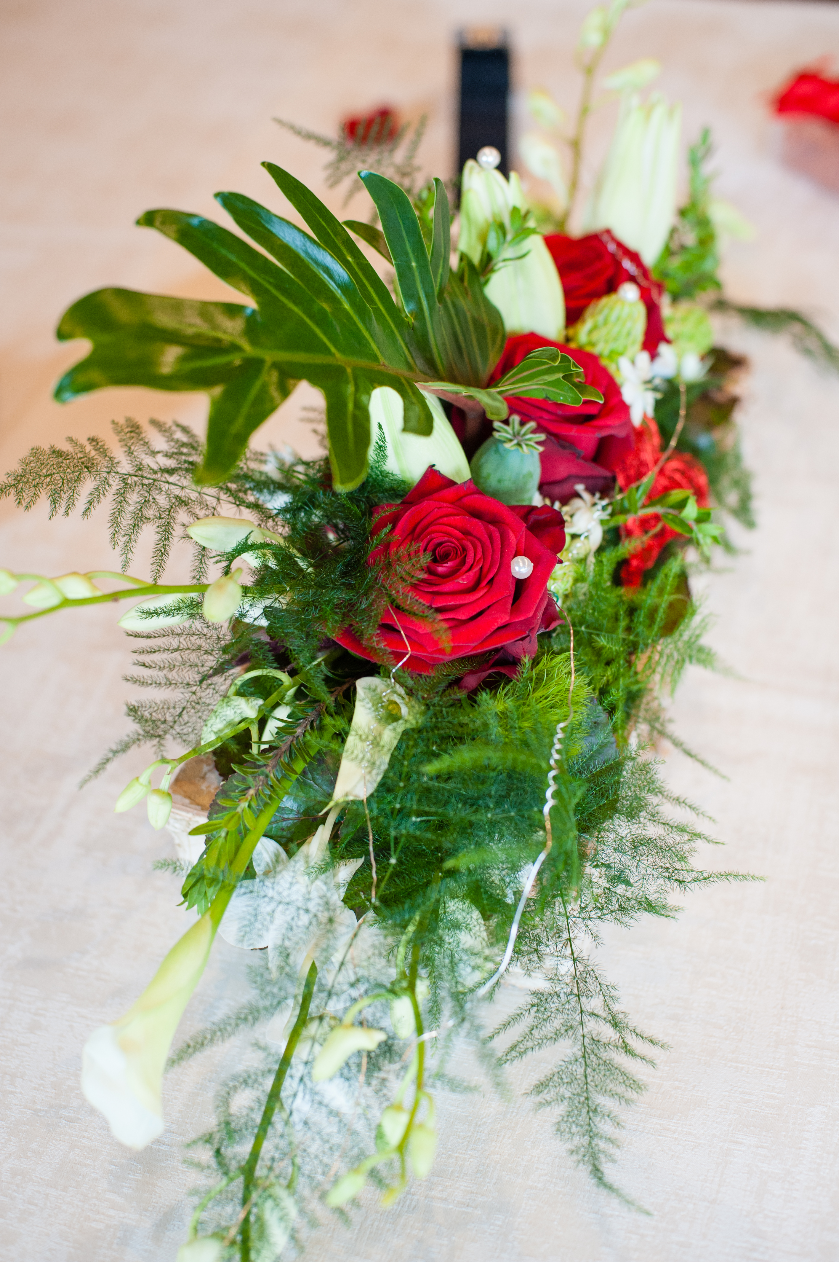 Ein schönes Gesteck mit Rosen auf dem Tisch im Standesamt
