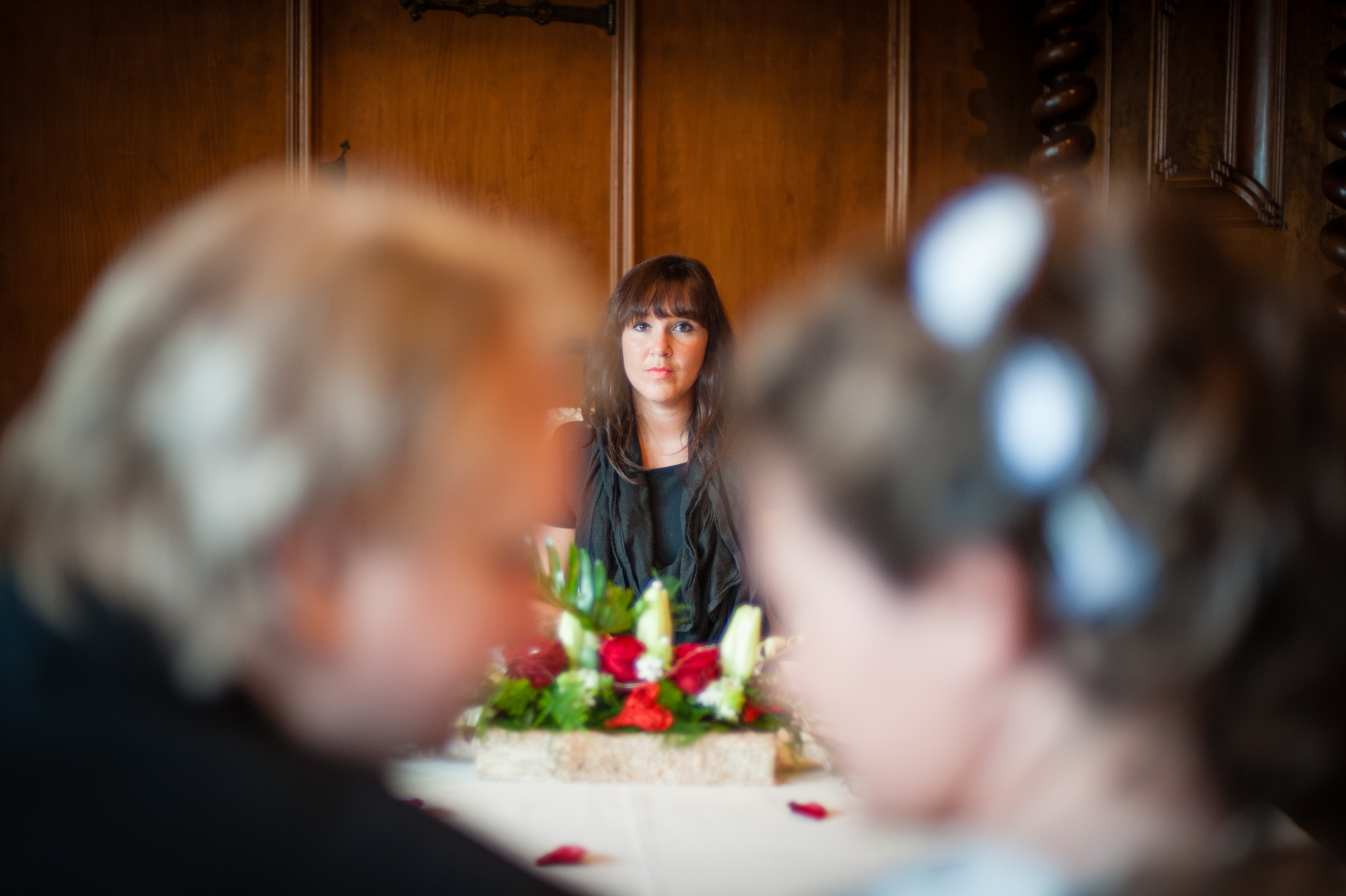 Zwischen den Köpfen des Brautpaares sieht man die Standesbeamtin nach der Trauung.